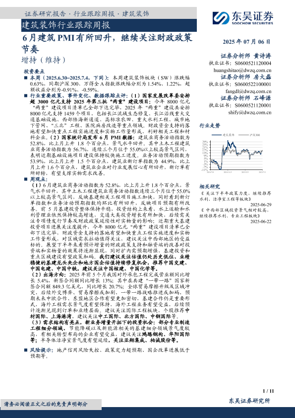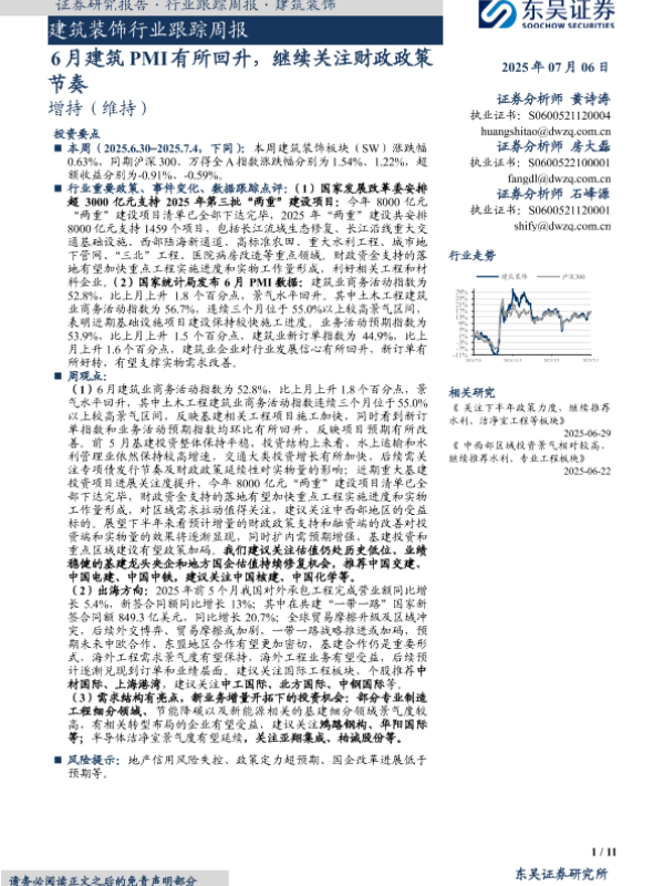 【东吴证券】【20250706】建筑装饰行业跟踪周报_6月建筑PMI有所回升_继续关注财政政策节奏-11页