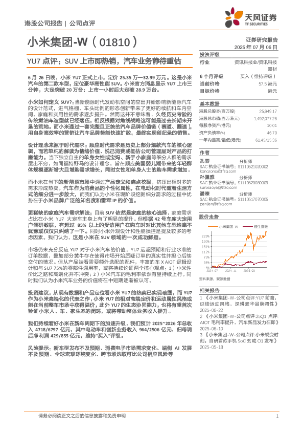 【天风证券】【20250706】YU7点评:SUV上市即热销,汽车业务静待重估-2页