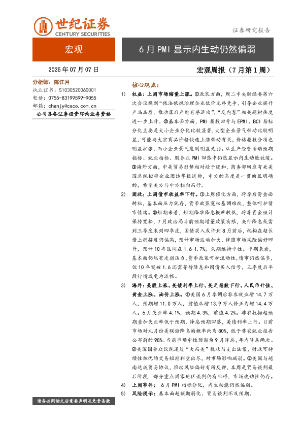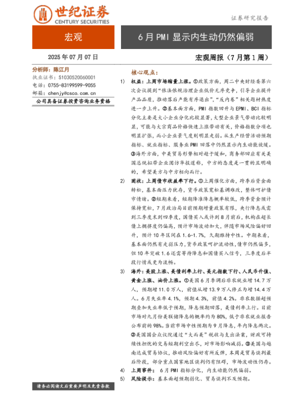 【世纪证券】【20250707】6月PMI显示内生动仍然偏弱-7页