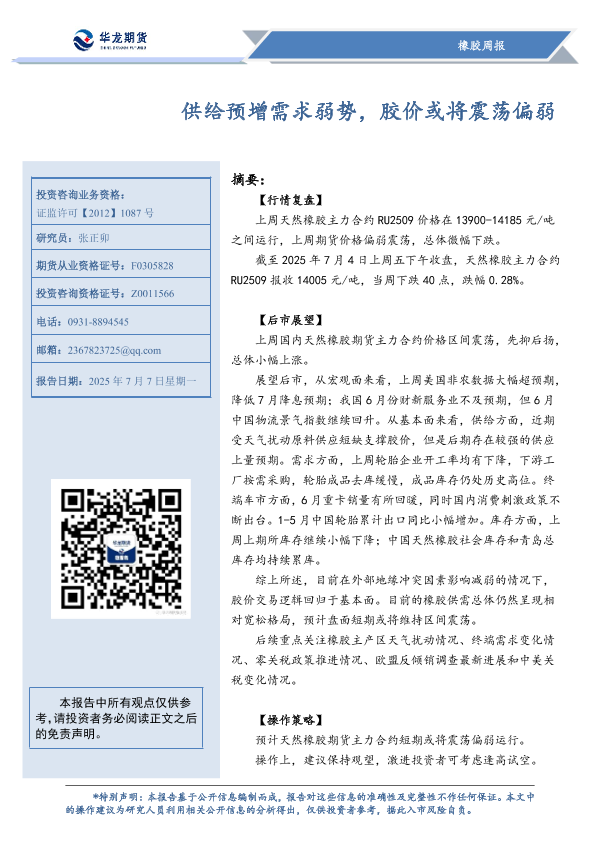 【华龙期货】【20250707】橡胶周报_供给预增需求弱势_胶价或将震荡偏弱-15页