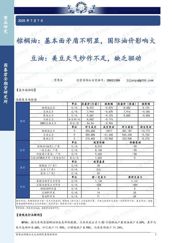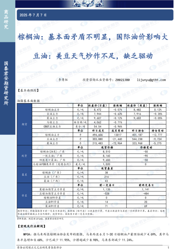 【国泰君安期货】【20250707】棕榈油_基本面矛盾不明显_国际油价影响大_豆油_美豆天气炒作不足_缺乏驱动-3页