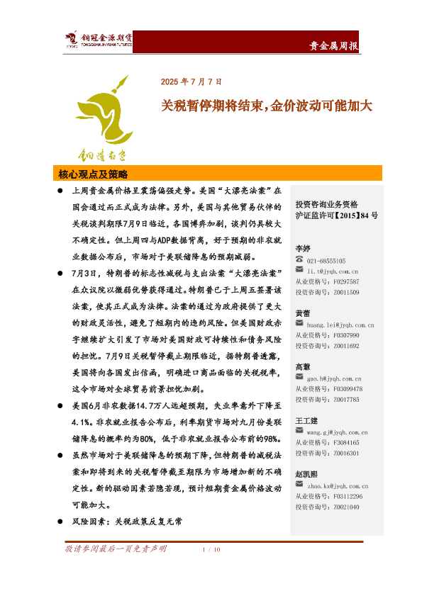 【铜冠金源期货】【20250707】贵金属周报_关税暂停期将结束_金价波动可能加大-10页