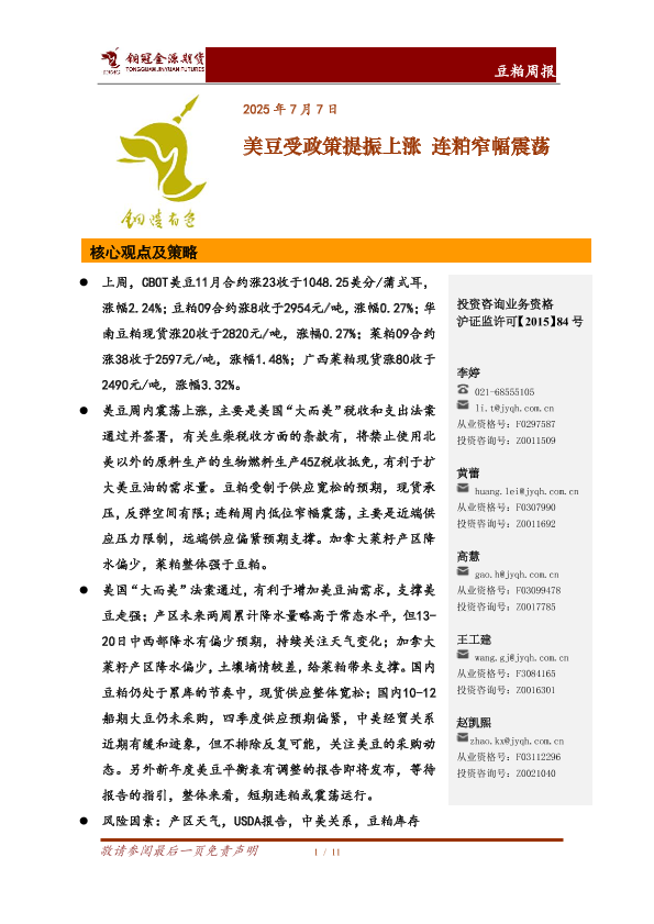 【铜冠金源期货】【20250707】豆粕周报_美豆受政策提振上涨_连粕窄幅震荡-11页