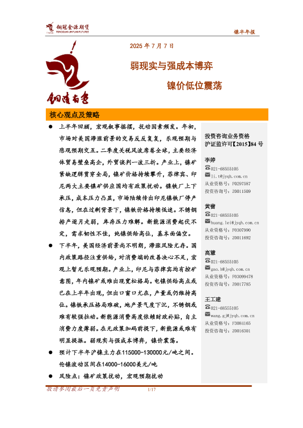 【铜冠金源期货】【20250707】镍半年报_弱现实与强成本博弈_镍价低位震荡-17页