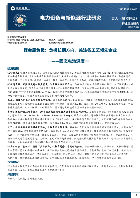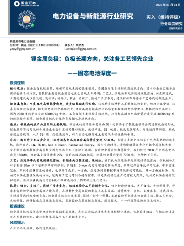 【国金证券】【20250704】固态电池深度一:锂金属负极,负极长期方向,关注各工艺领先企业-22页