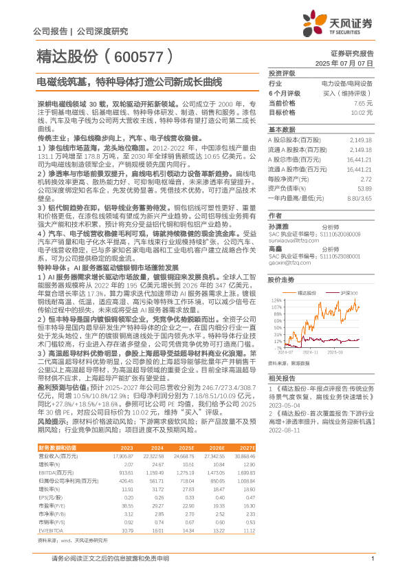 市场分析 特种导体 电磁线 电网设备 精达股份
