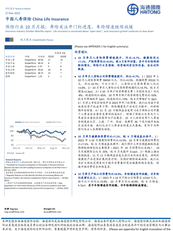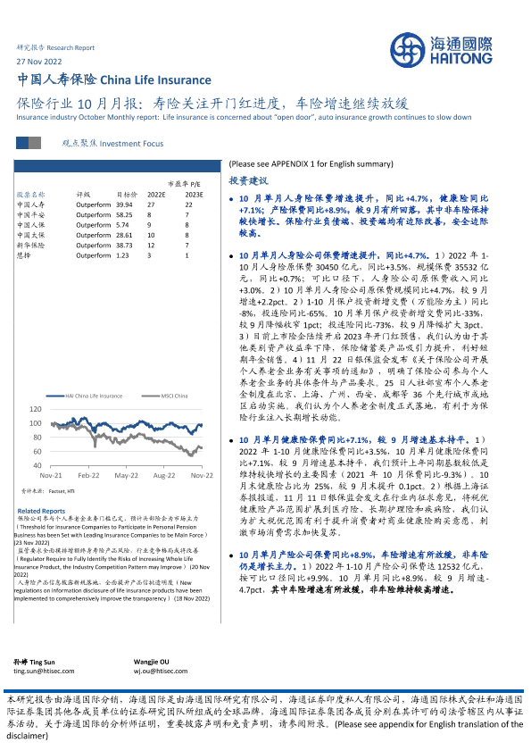 【海通国际】【20221207】保险行业10月月报:寿险关注开门红进度,车险增速继续放缓-14页