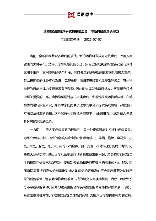 【深圳汉鼎智库咨询服务】【20250707】动物模型是临床研究的重要工具,市场具备高增长潜力-3页