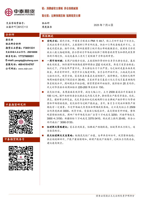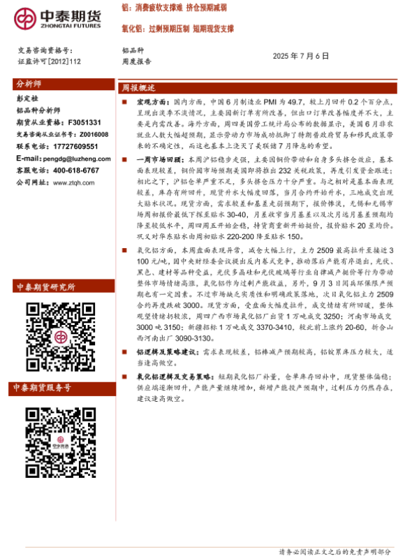 【中泰期货】【20250706】铝:消费疲软支撑难挤仓预期减弱 氧化铝:过剩预期压制短期现货支撑-10页