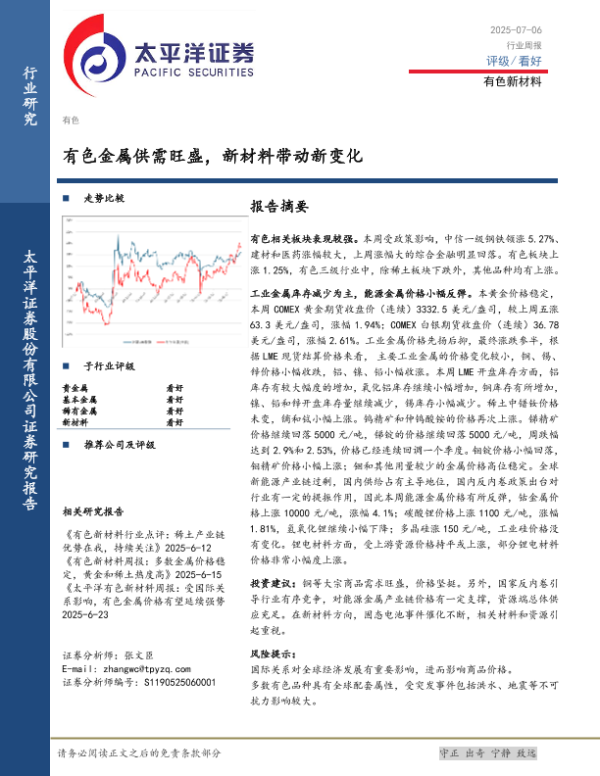 【太平洋证券】【20250706】有色新材料行业周报_有色金属供需旺盛_新材料带动新变化-12页