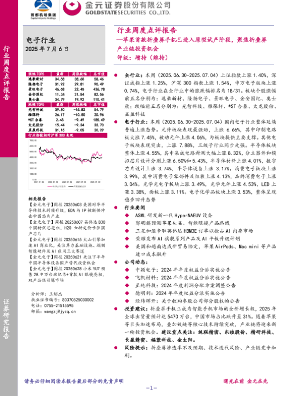【金元证券】【20250706】电子行业周度点评报告:苹果首款折叠屏手机已进入原型试产阶段,聚焦折叠屏产业链投资机会-19页
