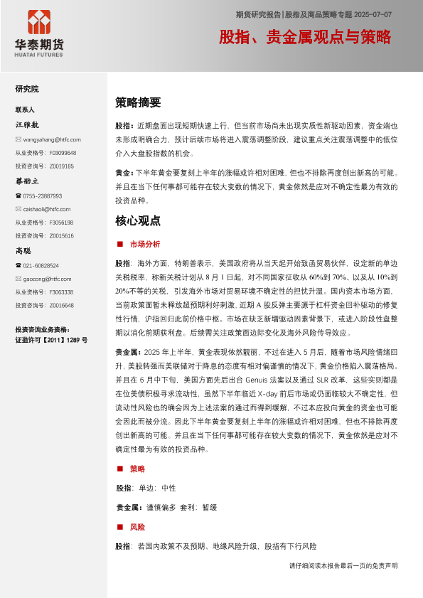 【华泰期货】【20250707】股指及商品策略专题_股指_贵金属观点与策略-11页