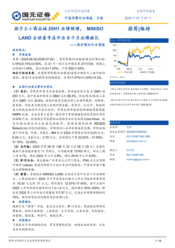 【国元证券】【20250707】美护商社行业周报_孩子王小商品城25H1业绩预增_MINISO LAND全球壹号店开业9个月业绩破亿-12页