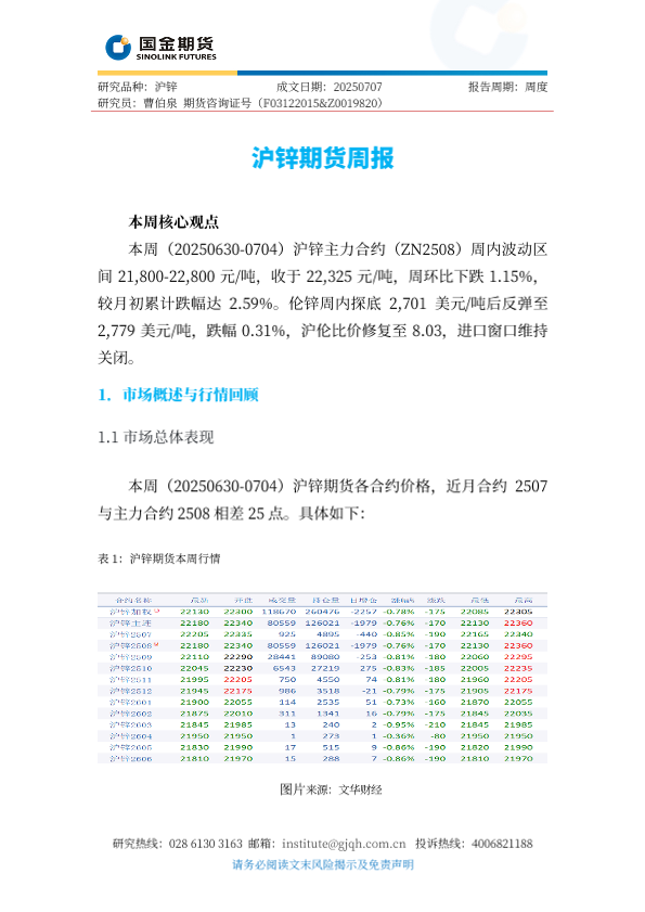 期货周报 沪锌期货 行情分析 金属期货 锌市场