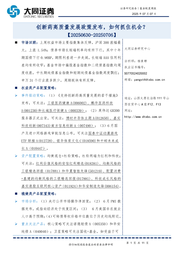 【大同证券】【20250707】基金配置周报_创新药高质量发展政策发布_如何抓住机会-11页