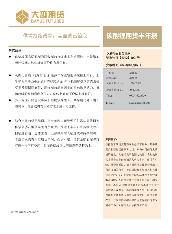 【大越期货】【20250707】碳酸锂期货半年报_供需持续改善_盘面或已触底-17页