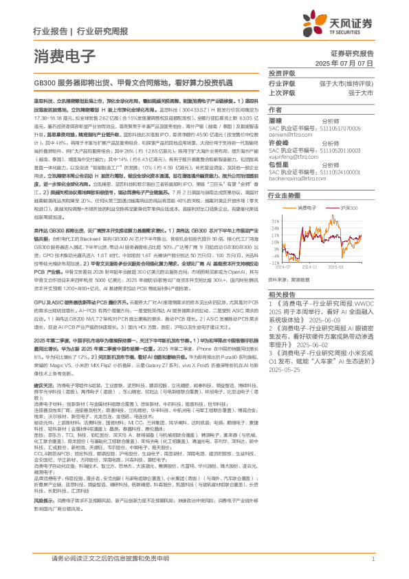 【天风证券】【20250707】消费电子行业研究周报 GB300服务器即将出货, 甲骨文合同落地, 看好算力投资机遇-17页