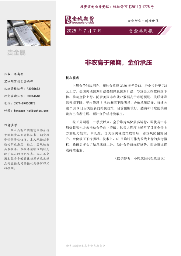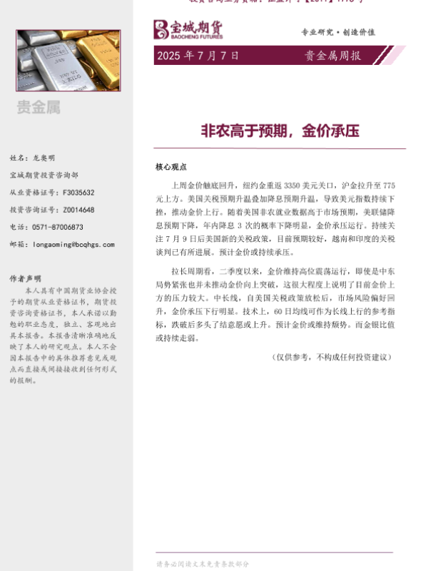 【宝城期货】【20250707】贵金属周报_非农高于预期_金价承压-9页
