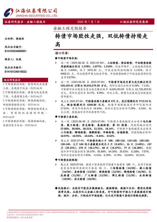 【江海证券】【20250707】转债市场股性走强,双低转债持续走高-12页