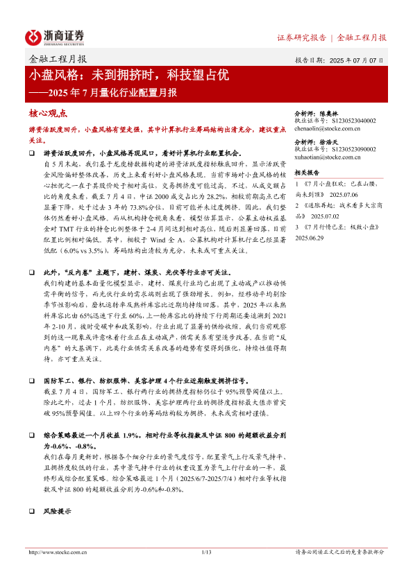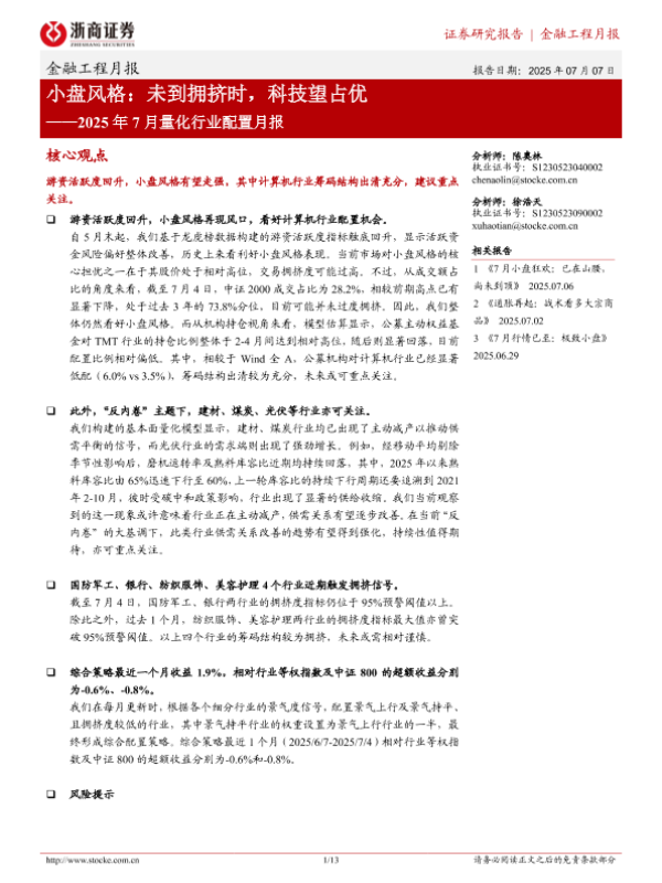 【浙商证券】【20250707】2025年7月量化行业配置月报_小盘风格_未到拥挤时_科技望占优-13页