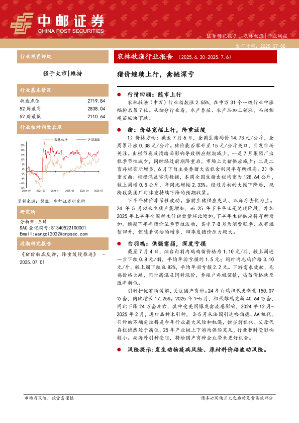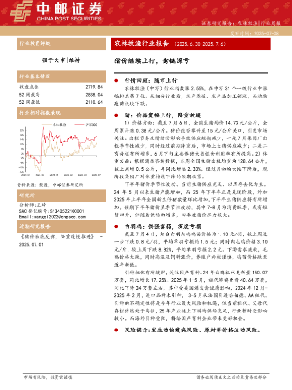【中邮证券】【20250708】农林牧渔行业报告_猪价继续上行_禽链深亏-12页