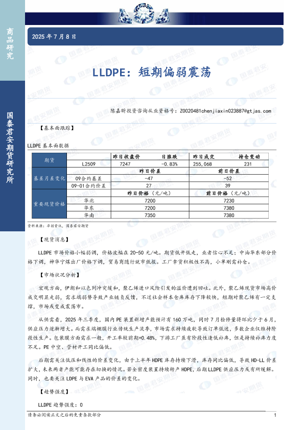 【国泰君安期货】【20250708】LLDPE:短期偏弱震荡-3页