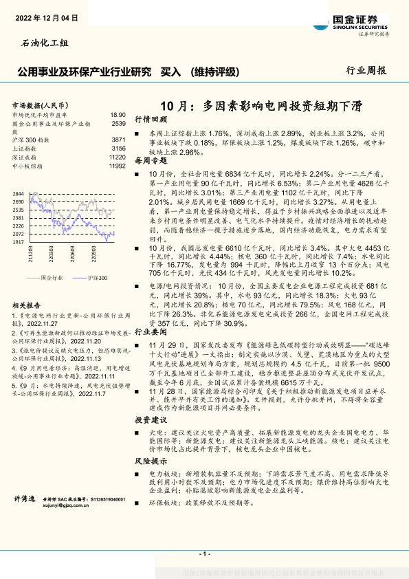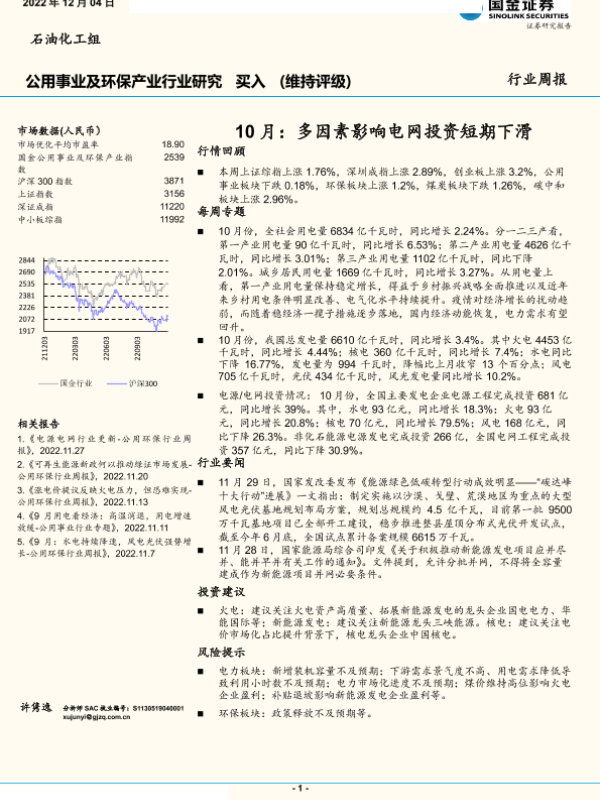 【国金证券】【20221204】公用环保行业周报:10月,多因素影响电网投资短期下滑-17页