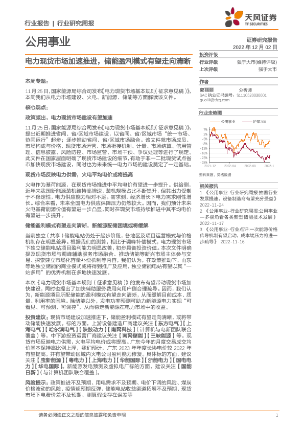 【天风证券】【20221202】公用事业行业研究周报:电力现货市场加速推进,储能盈利模式有望走向清晰-14页