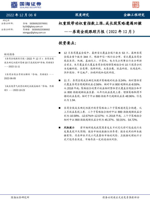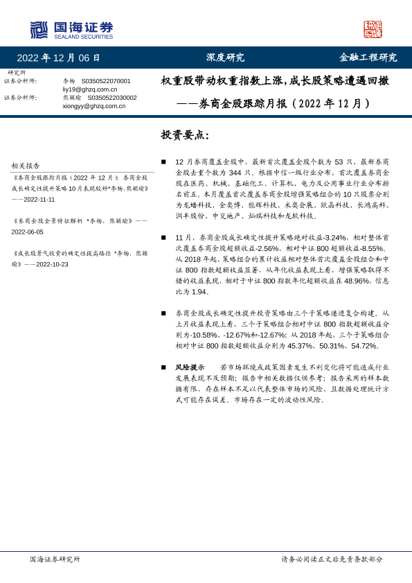 【国海证券】【20221206】券商金股跟踪月报(2022年12月):权重股带动权重指数上涨,成长股策略遭遇回撤-16页