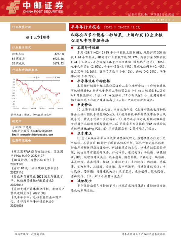【中邮证券】【20221203】半导体行业报告:积塔公布多个设备中标结果,上海印发IC企业核心团队专项奖励办法-20页