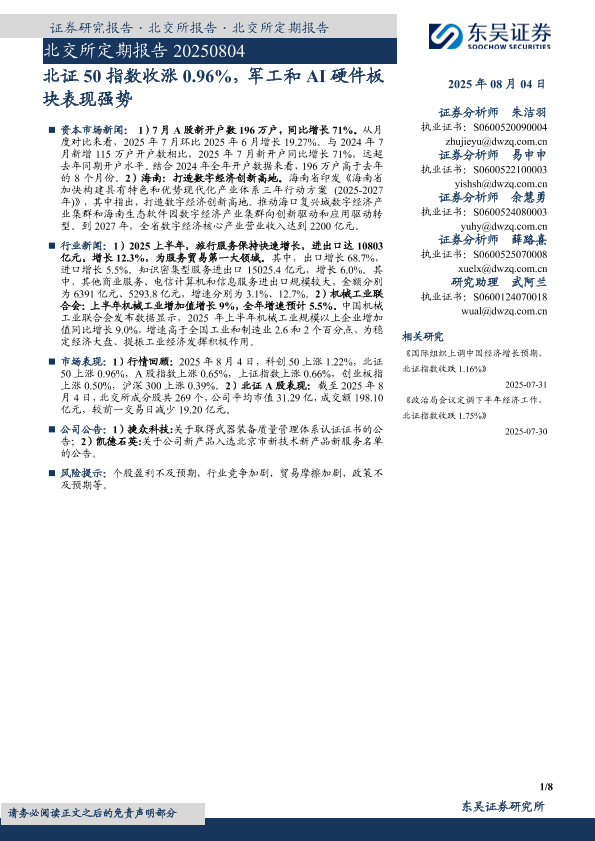 【东吴证券】【20250804】北交所定期报告:北证50指数收涨0.96%,军工和AI硬件板块表现强势-8页