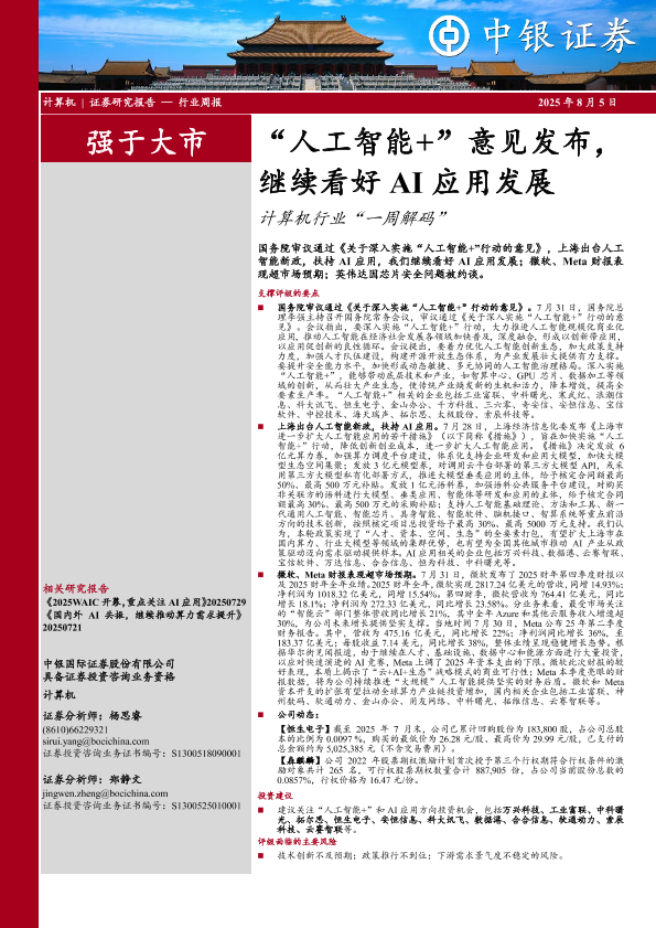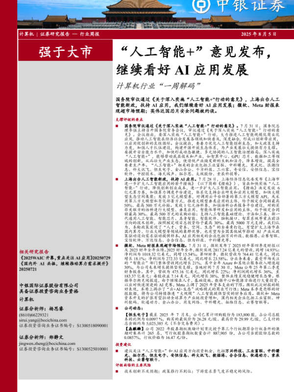 【中银证券】【20250805】计算机行业“一周解码”:“人工智能+”意见发布,继续看好AI应用发展-11页