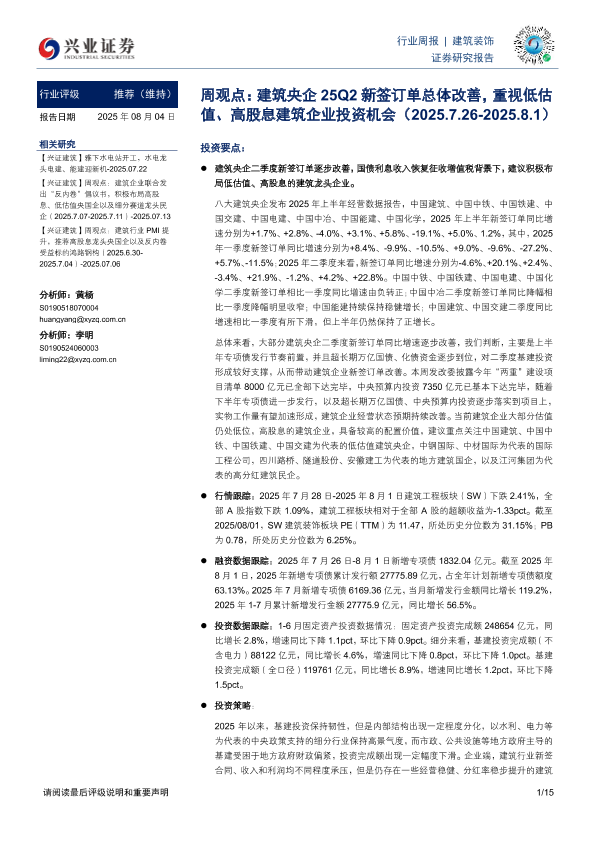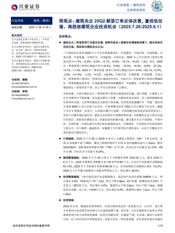 【兴业证券】【20250804】建筑装饰行业周观点:建筑央企25Q2新签订单总体改善,重视低估值、高股息建筑企业投资机会-15页