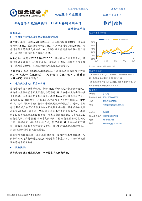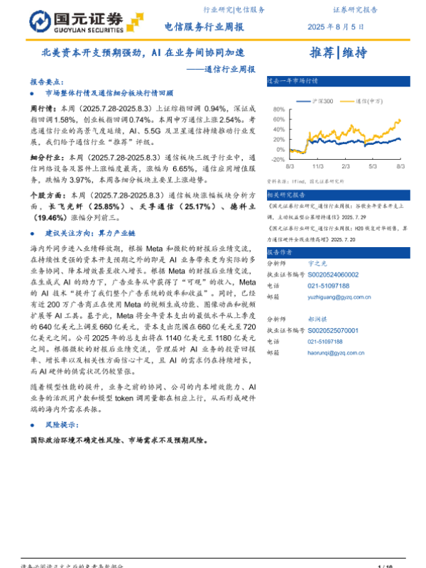 【国元证券】【20250805】通信行业周报:北美资本开支预期强劲,AI在业务间协同加速-10页