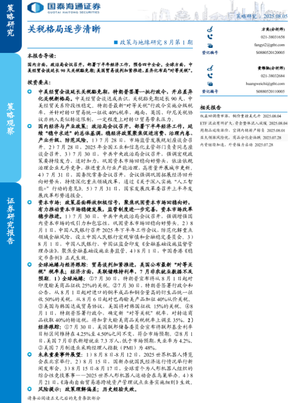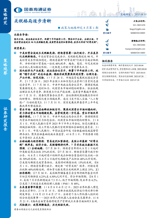 【国泰海通证券】【20250805】政策与地缘研究8月第1期:关税格局逐步清晰-10页