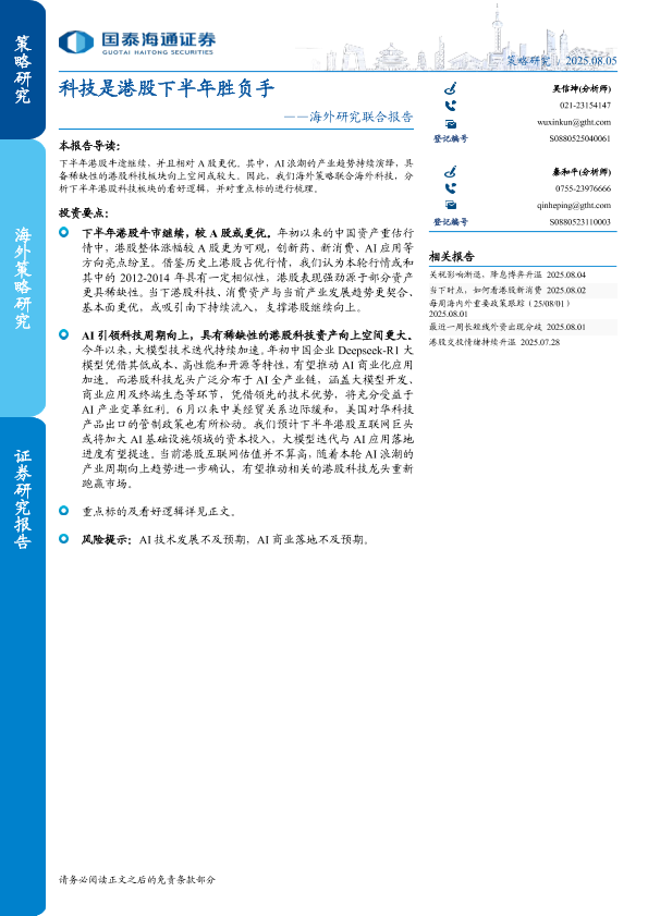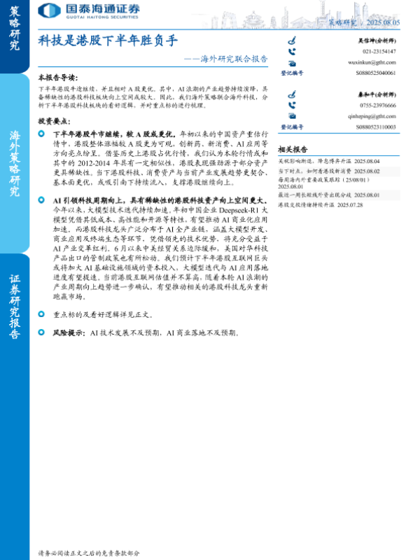 【国泰海通证券】【20250805】科技是港股下半年胜负手-7页