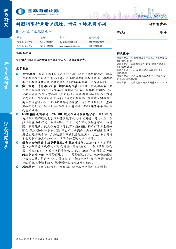 【国泰海通证券】【20250805】电子烟行业跟踪点评:新型烟草行业增长提速,新品市场表现可期-3页