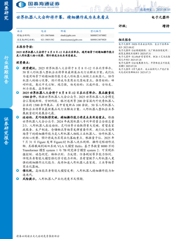 【国泰海通证券】【20250805】世界机器人大会即将开幕,精细操作或为未来看点-3页