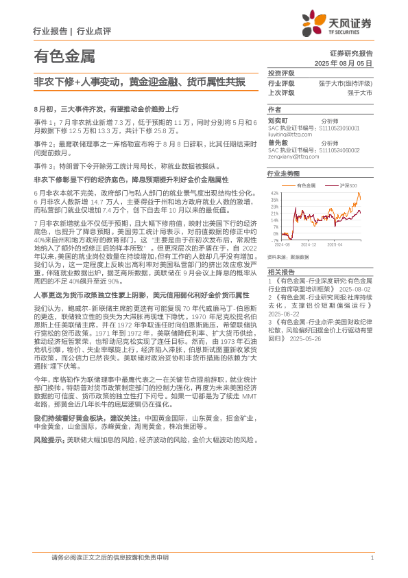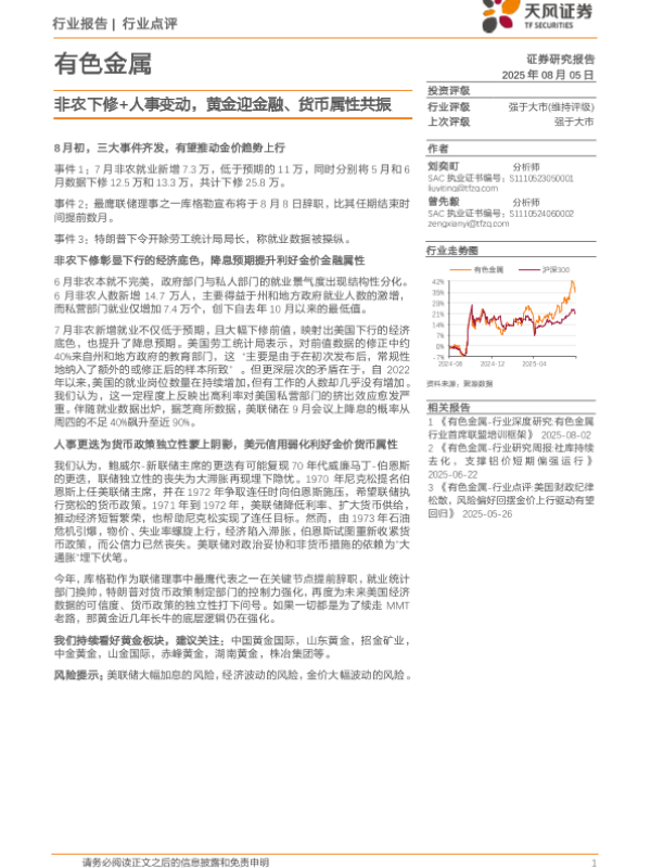 【天风证券】【20250805】有色金属行业点评:非农下修+人事变动,黄金迎金融、货币属性共振-2页