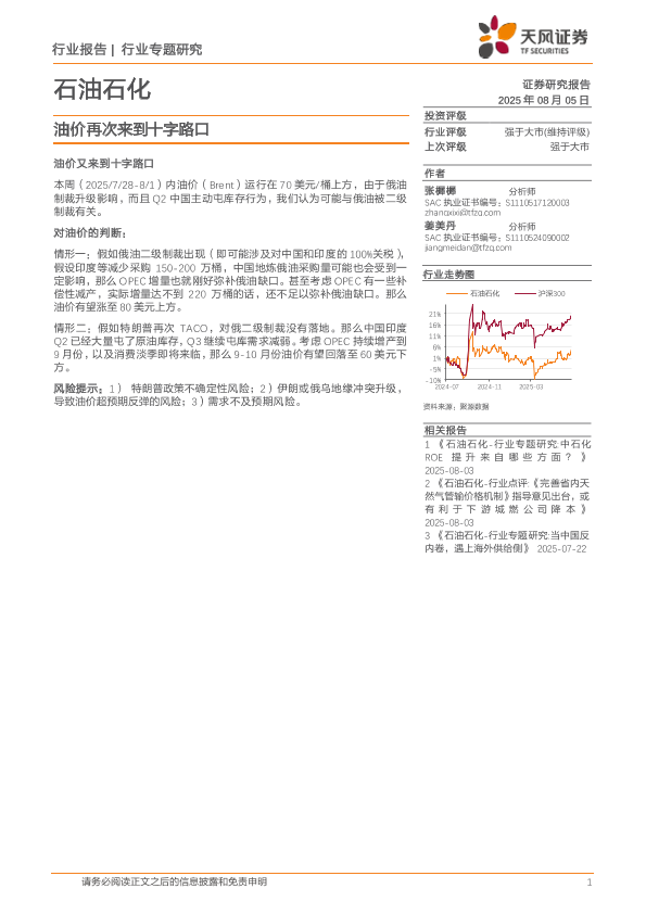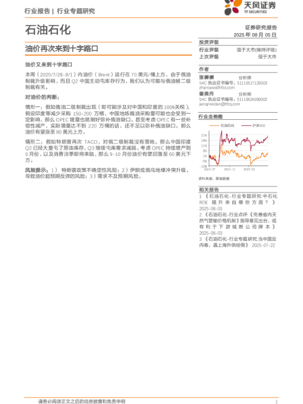 【天风证券】【20250805】石油石化行业专题研究:油价再次来到十字路口-6页