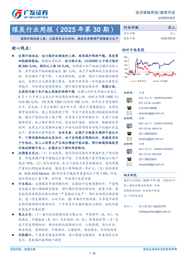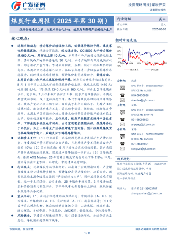 【广发证券】【20250803】煤炭行业周报(2025年第30期):煤焦价格延续上涨,北港库存去化加快,能源局再强调严禁超能力生产-18页