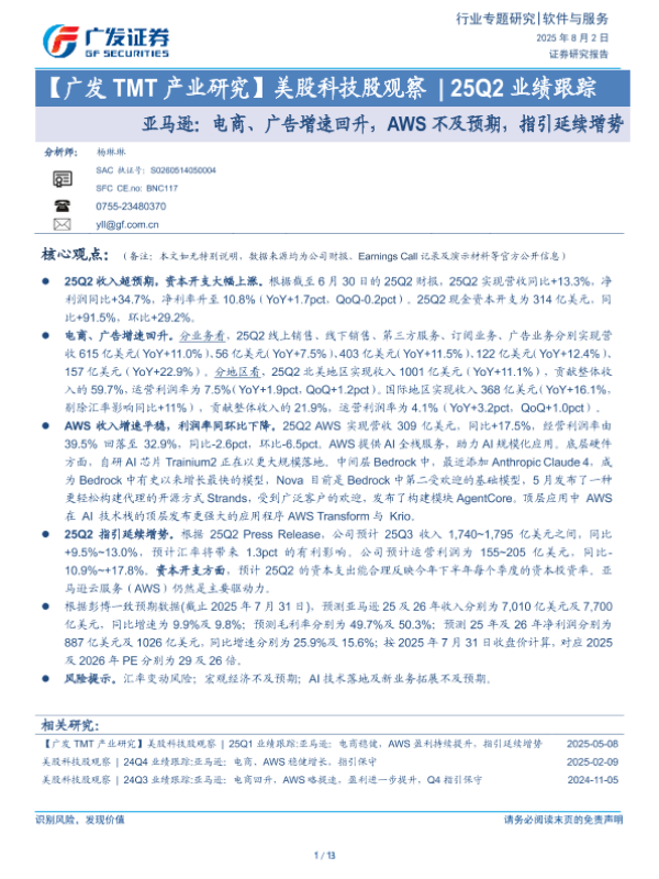【广发证券】【20250802】美股科技股观察25Q2业绩跟踪:亚马逊,电商、广告增速回升,AWS不及预期,指引延续增势-13页