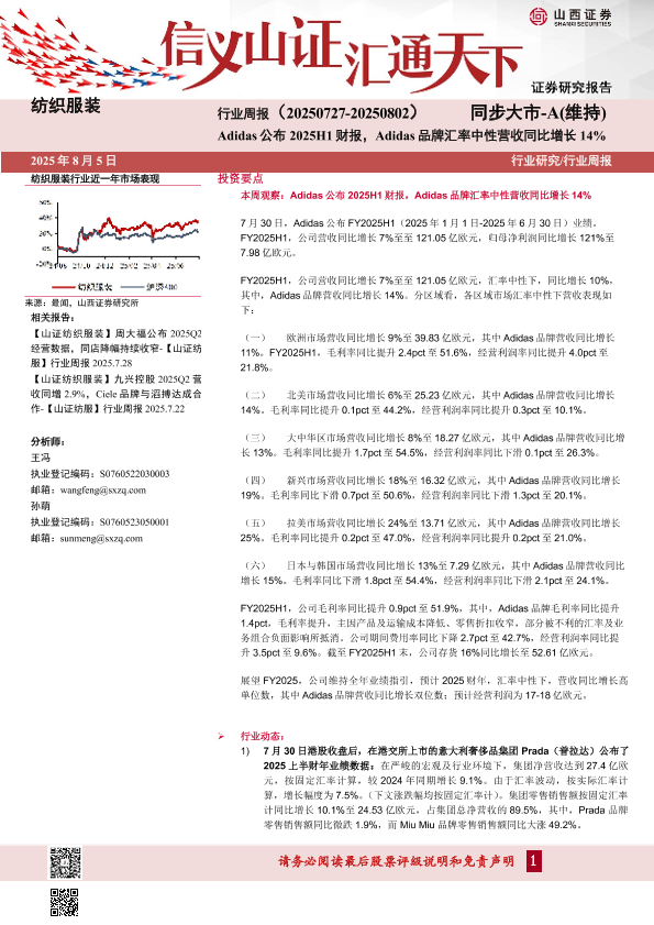 【山西证券】【20250805】纺织服装行业周报:Adidas公布2025H1财报,Adidas品牌汇率中性营收同比增长14%-19页