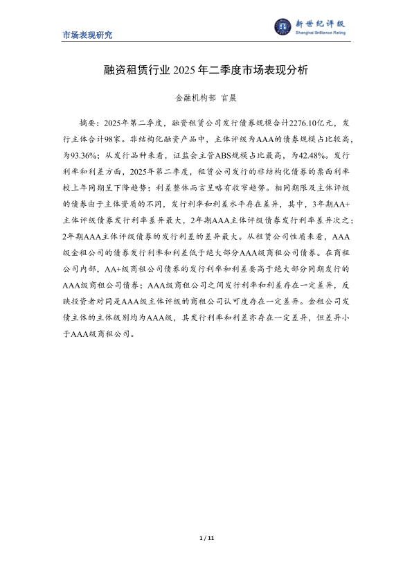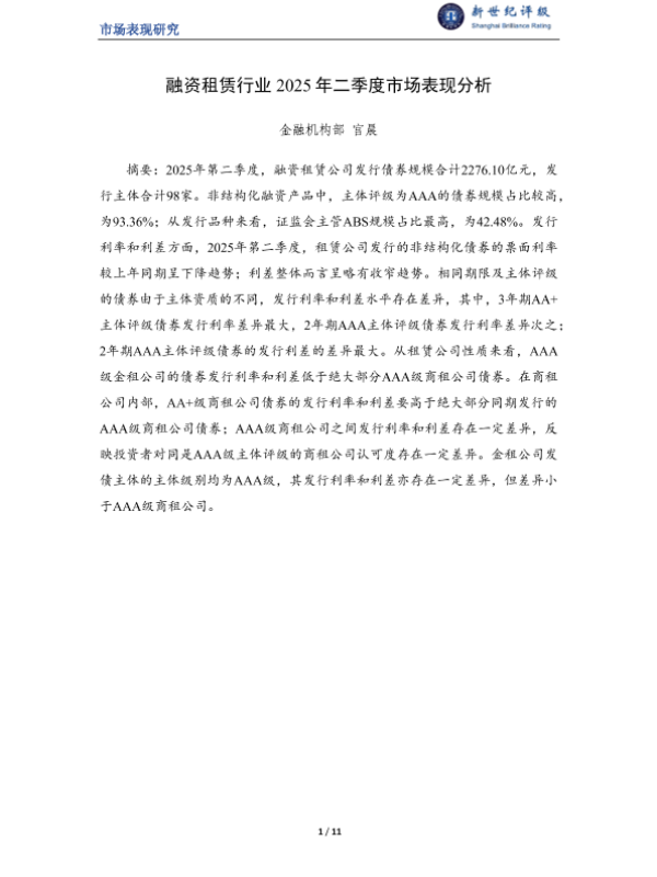 【新世纪评级】【20250805】融资租赁行业2025年二季度市场表现分析-11页