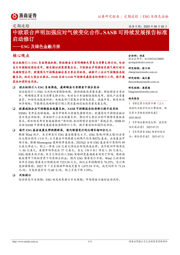 【浙商证券】【20250805】ESG及绿色金融月报:中欧联合声明加强应对气候变化合作,SASB可持续发展报告标准启动修订-31页