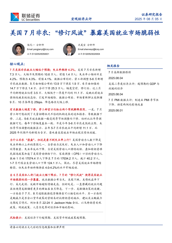 【联储证券】【20250805】美国7月非农:“修订风波”暴露美国就业市场脆弱性-11页