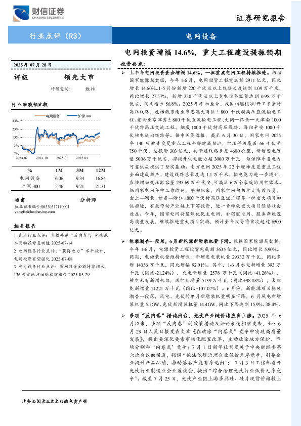 【财信证券】【20250728】电网设备行业点评:电网投资增幅14.6%,重大工程建设提振预期-8页