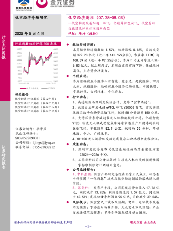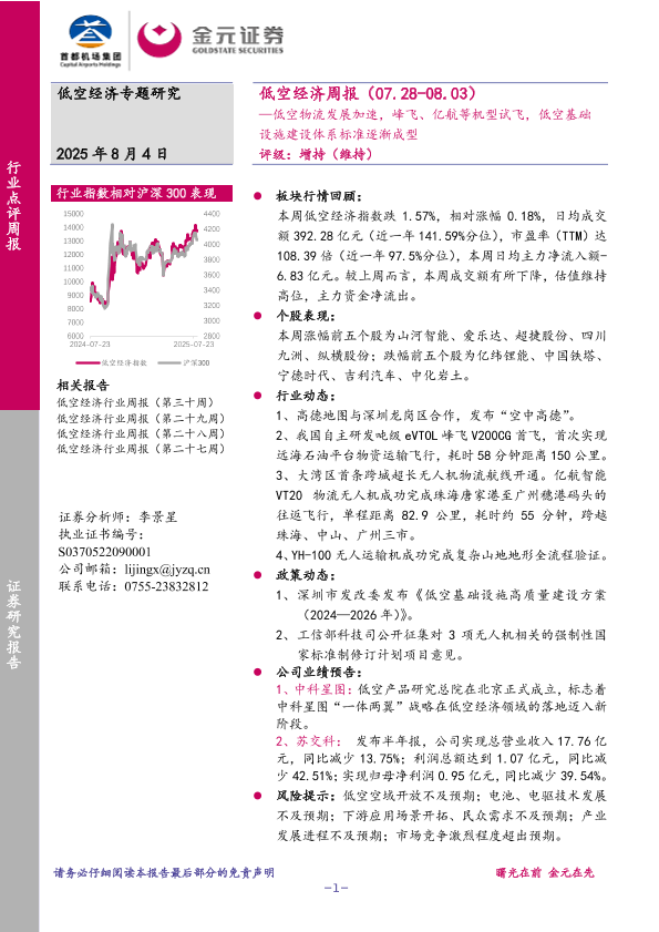 【金元证券】【20250804】低空经济行业周报:—低空物流发展加速,峰飞、亿航等机型试飞,低空基础设施建设体系标准逐渐成型-12页