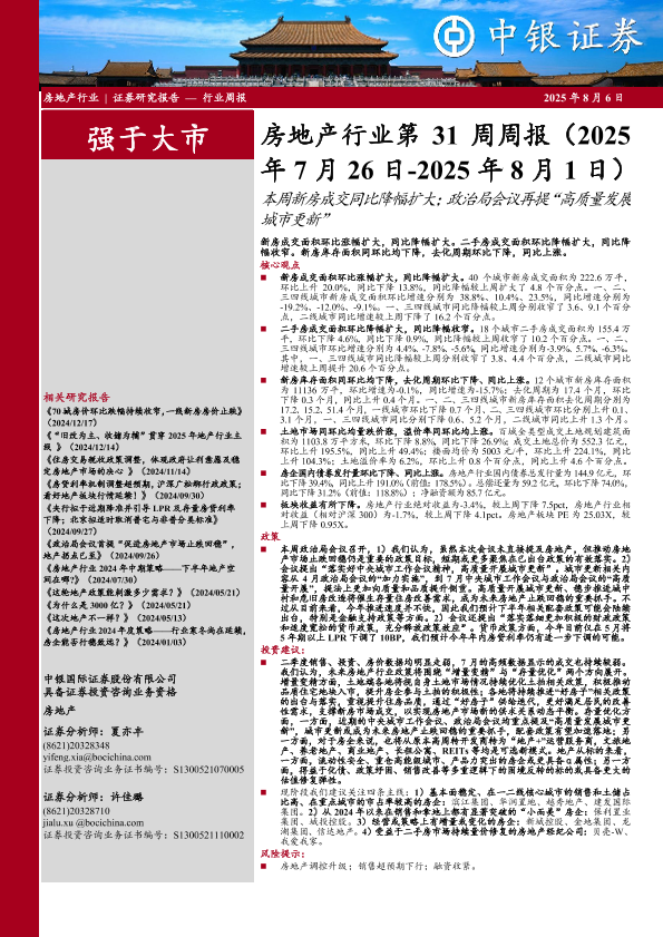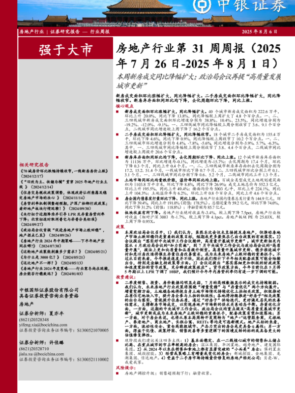【中银证券】【20250806】房地产行业第31周周报(2025年7月26日~2025年8月1日):本周新房成交同比降幅扩大;政治局会议再提“高质量发展城市更新”-24页