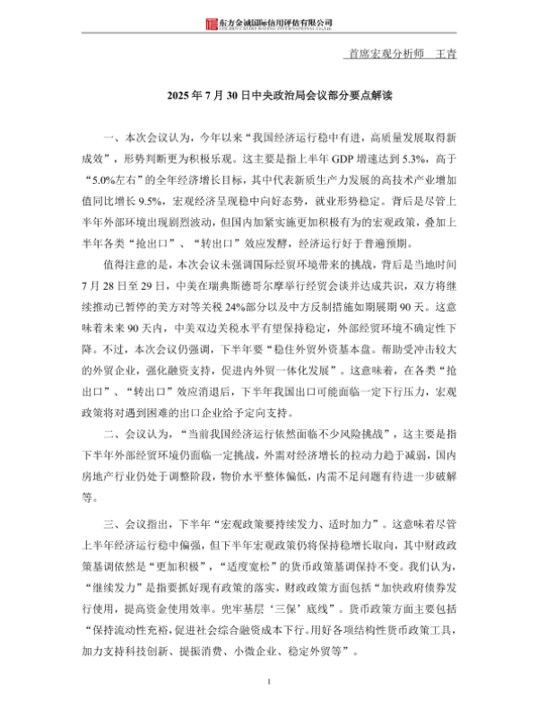 【东方金诚】【20250730】2025年7月30日中央政治局会议部分要点解读-3页
